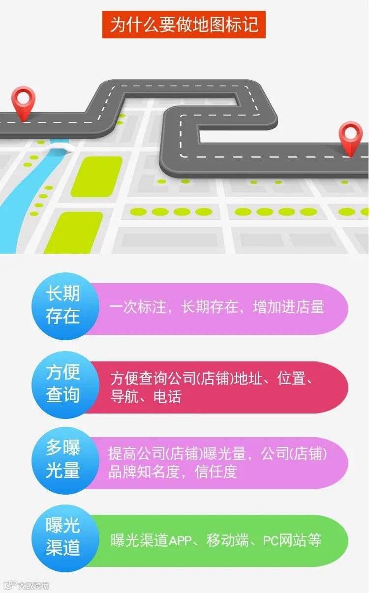 在地图上进行信息标注,可以一目了然的在软件上显示自家店面的电话、营业时间等信息,还能够让消费者更方便的联系店面,更可以提高曝光率,方便消费者顺利查找并到店消费。特别是那些位置比较偏僻的商家,由于到店的导航路线信息的缺失,有可能就会造成客户上门的流失,所以在地图上标注店铺信息就格外的重要。需要请添加我们客服微信或者电话咨询:15730087443。