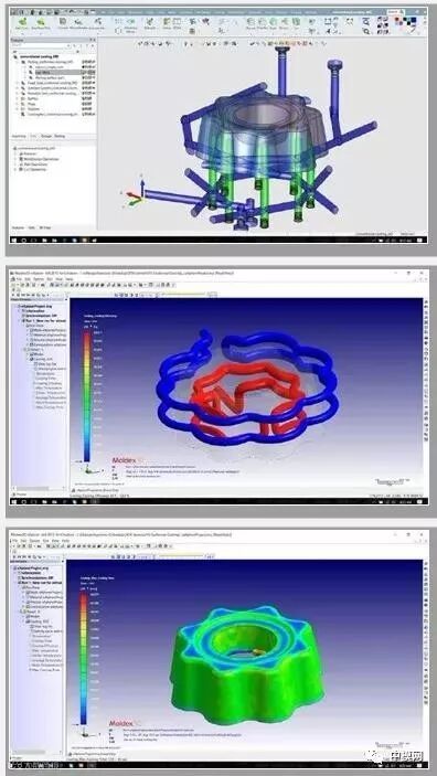 上:传统的水道设计; 中:用Cimatron设计的用于型芯和型腔的随形冷却水道;