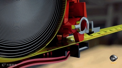 由于金属条缠绕在中心轮轴上,这就变成了一个强力的弹簧了,当卷尺拉出的越多,弹簧的压力就越大,只要一放开扣锁,弹簧需要回位,卷尺叶就立马跟着收进去了