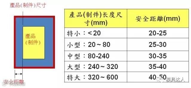 註:模具設計時,會要求設計人員將模仁尺寸取為整數,因此安全距離並非定值;可根據產品(制件)尺寸做調整。