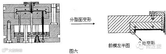 模具大镶件长期受压,甚至有时实际锁模力超过其所能随的最大压力,则导致大镶件的永久性变形,根据模具结构,往往凹模易变形,如图六。