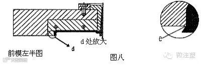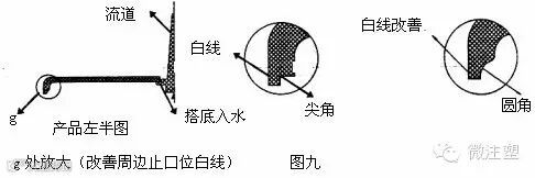 脱模过程中,胶件外层从残余应力下突然进入大气压力,塑件内层挤压外层(因残余应力作用),在脱模的一瞬间,暴露在大气压中的胶件部位迅速膨胀。如右图(八)胶件e处受到极大的拉应力,所以此处易出现白线。白线之处往往是受力较大或比较薄弱的地方。
