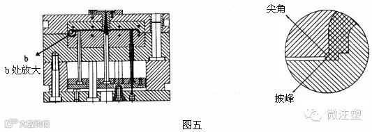 所以当F锁> F内+F支时,模具要合紧,胶件受压缩,由于周边有一定的脱模斜度,所以整个周边此时受到一个沿锁模方向的拉应力,而分型面处胶件最薄弱(因有披峰而存在尖角),故白线往往出现在图示尖角附近,如下图(五)。