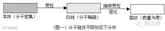 应力集中处是产品最薄弱的环节(如尖角,熔接不好,高度取向等),其受化学物质、光照、浸湿、溶剂等作用,高分子链容易被破坏(收缩或断裂),因而易产生白线或裂纹。