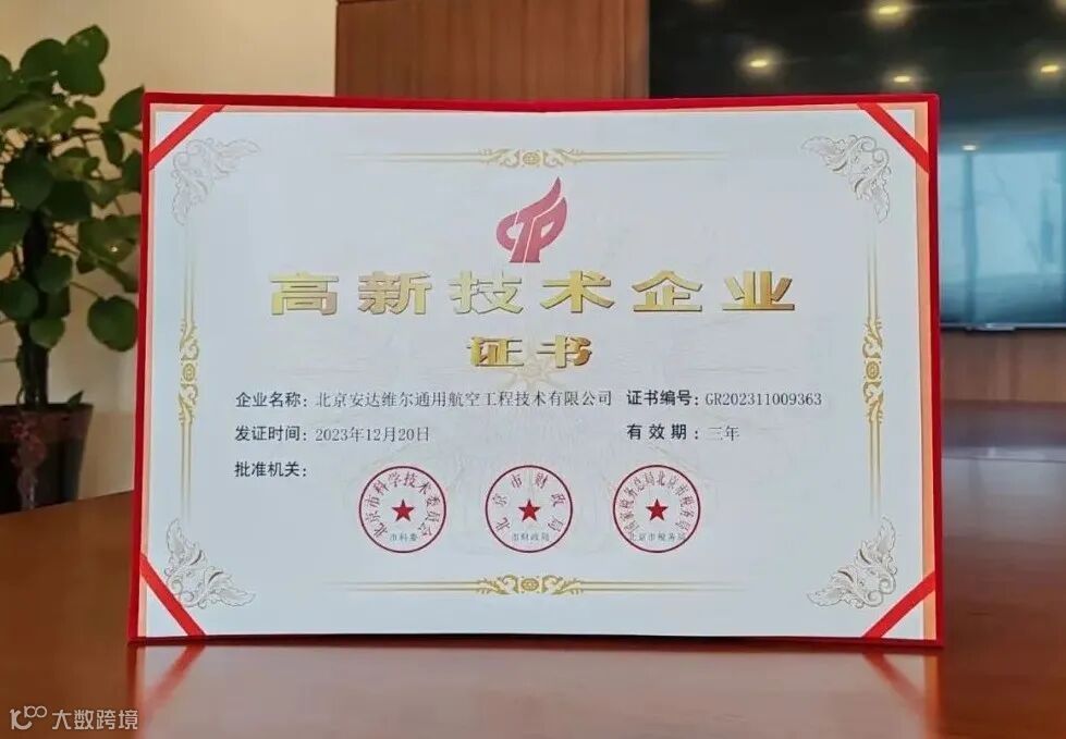 2023年12月20日,全国高新技术企业认定管理工作领导小组办公室公示了北京市2023年认定报备的第四批高新技术企业名单,安达维尔全资子公司北京安达维尔信息技术有限公司与北京安达维尔通用航空工程技术有限公司顺利通过2023年第四批高新技术企业认定,并颁发了高新技术企业证书,此项荣誉是国家对公司在行业内科技创新水平等综合实力的权威认可。