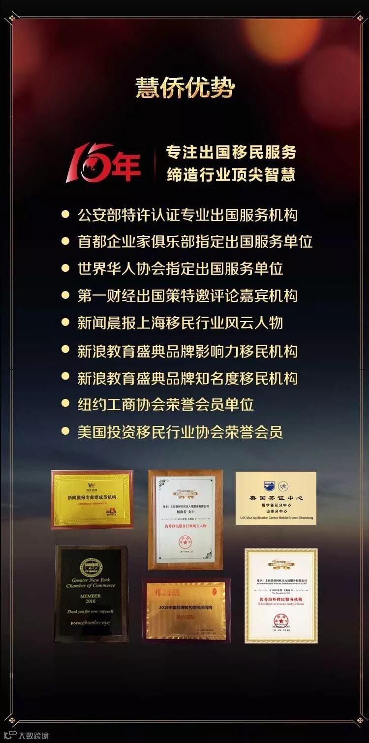 慧侨出国服务集团,专注出国服务18年。我们优势在于:1、全领域、全类别项目覆盖,做到推荐合适的移民方案;2、强大的量身定制服务能力,把脉精准,成功率高;3、能够把控移民项目合适的申请时机,确保低成本快速度获取海外身份。
