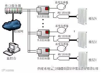 按照建筑物内温区的分布安装室内主机用于监测楼内各个不同采样点的实时温度(主要为控制供热量提供依据)。根据建筑物内供暖管网的分布特性,选择在每栋楼的供暖管前端或每层楼的水平供暖前端安装电动调节阀,系统根据采集到的实时温度或楼层平均温度自动调节电动阀,使楼层温度处于规定范围内。在非工作时段内根据设定温度自动降低大楼供暖,使大楼内温度保持在一个相对较低的温度范围内,从而实现最大限度节约热能。系统结构示意图如下: