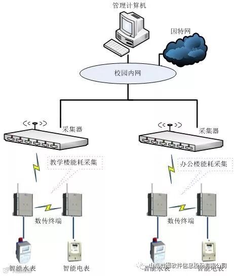 能耗监测管理系统对校园内各类能耗进行实时监测、采集与存贮各类能耗数据,并对数据进行统计与分析,使学校管理部门对校园内各种能耗进行有效的监测与管理,为校园节能降耗研究、设计改(建)造提供参考数据;对已实施节能改造的建筑提供节能效果真实数据,同时还可以显示、查寻、打印、发布、远程传输数据。系统结构示意图如下: