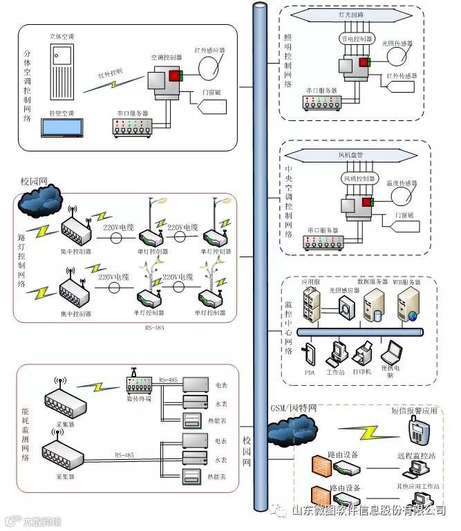随着我国经济的高速发展,建筑能耗,特别是国家机关办公建筑和大型公共建筑高耗能的问题日益突出。学校属大型公共机构建筑的重要组成部分之一,其特点是占地面积大,建筑物种类及数量多,校园供配电系统及自来水管网、热网面广、量大。目前校园的能耗、水耗抄表数据不完整、不全面,造成管理不到位、能源利用存在较大的浪费现象。为了确保校园正常教学与科研的能源需求且实现有效节能,建立能源远程监控与管理系统、掌握校园水、电、暖、气能耗的实时数据、对校园各种能源系统进行分布式监控与集中管理。