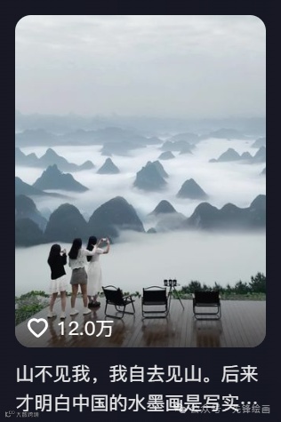 03.《云雾山峰》这类作品本月很多作者都做爆了。最高做到了12万点赞,同学们到抖音搜索:“山不见我,我自去见山。后来才明白中国的水墨画是写实。来翻翻我的作品吧,一定能够治愈你” 标题就可以看到大量这样的作品。