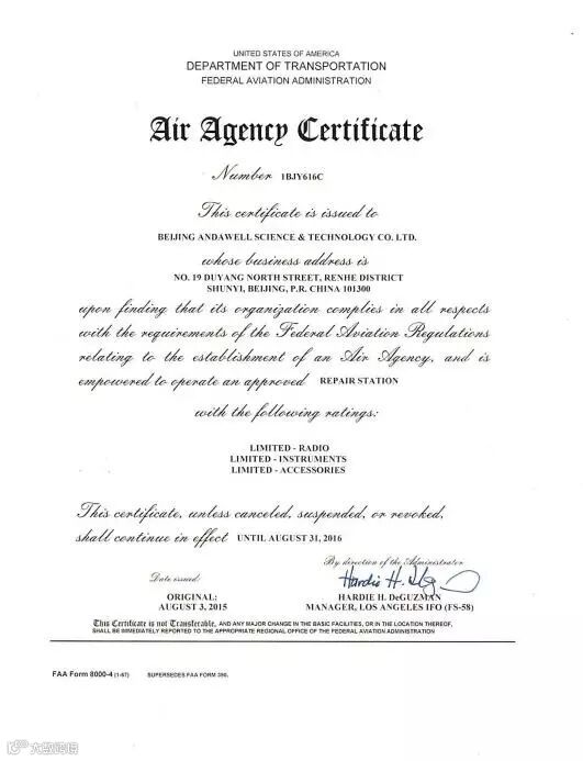 2015年8月,Andawell公司正式取得FAA维修许可证,标志着Andawell公司同时拥有CAAC、EASA、FAA的维修能力,这项认可对提升企业综合实力意义重大,同时也为今后开拓国际市场奠定坚实的基础。