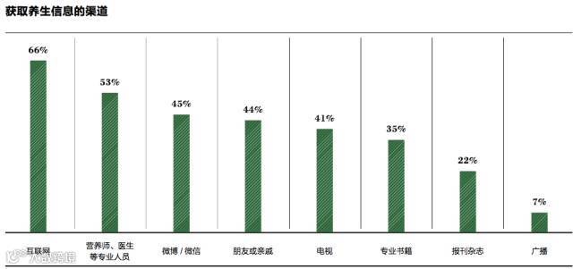 想要身体健康,不仅要动,还要养。年轻人经常“吐槽”自己的父母在朋友圈里转发养生知识。但有趣的是,身价千万的富豪们也会看网络上的养生信息。《白皮书》显示,64%的被访者会主动关注养生方面的信息。从渠道上来讲, 66%的高净值人群是通过互联网来了解养生信息的 ;其次是会听从“营养师、医生等专业人员的建议”,比例同样超过半数。