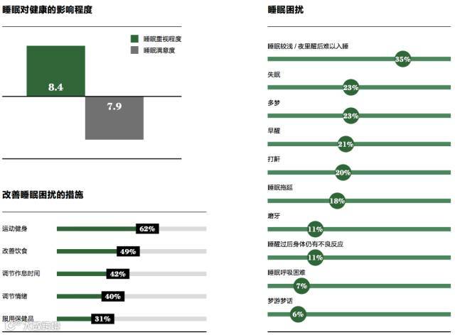 研究结果显示,中国高净值人群对睡眠重视程度得分高达8.4分,但与此形成鲜明对比的,他们对睡眠的满意程度仅7.9分。“睡眠较浅/夜里醒后难以入睡”是中国高净值人群遇到的比较集中的问题,其比例达到了35%,其次是失眠,比例也达到了23%。另外,“多梦”的症状多出现在年龄偏大的被访者中,且年龄越大此项比重越大。此外,三千万以上的高净值人群在“多梦”症状的占比,也远超过其他人群。