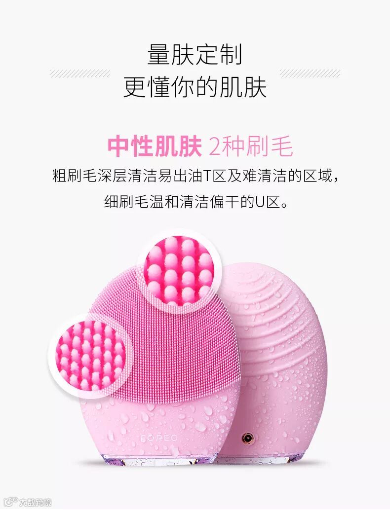它有两种刷毛,粗刷毛针对出油区域及难清洁部位,而细刷毛更温和,适合偏干燥的U区,并且它采用的是亲肤材质,是世界上首款亲肤硅胶材质的洁面仪哦!卫生耐用,不用换刷头。