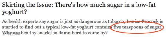 营养学家Louisa Peacock发现一款著名的0脂肪酸奶中竟然含有五勺糖:
