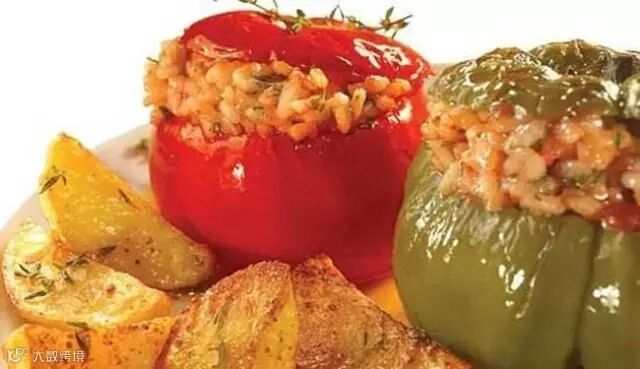 番茄和青椒煨饭(Gemista)是非常经典的希腊菜肴,当然,不仅仅局限于是番茄,红甜椒和茄子也适合做这道菜。把米饭和肉末放进掏空了的西红柿或者是灯笼辣椒里面,然后放入烤箱,出炉后,西红柿或辣椒的香味会完全融入米饭里面。