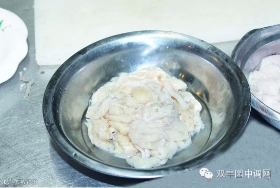 1、购入的牛、羊肚用清水冲去百叶间的杂物,然后取下羊肚的葫芦、蘑菇、食信放至一旁,将剩下的牛、羊肚分别放入加有冰块的保鲜盒中,灌满清水,入冰箱冷藏,客人点菜后再取出牛、羊肚,片下相应部位,改刀入菜。注意,切勿提前分档改刀,否则肚里的水分会沿着刀口流失,口感就不鲜脆了。