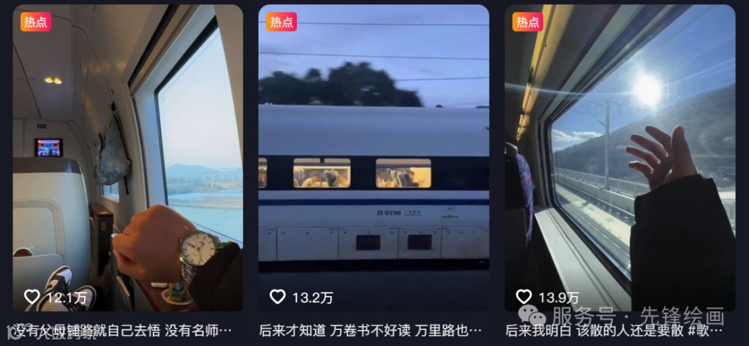 《回家高铁》这类作品本月很多作者都做爆了。最高做到了13.9万点赞,同学们到抖音搜索:“用归途的光照亮回家的路” 标题就可以看到大量这样的作品。