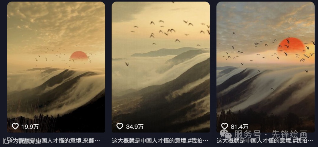 《相公山》这类作品本月很多作者都做爆了。最高做到了80.5万点赞,同学们到抖音搜索:“这大概是中国人才懂的意境吧” 标题就可以看到大量这样的作品。