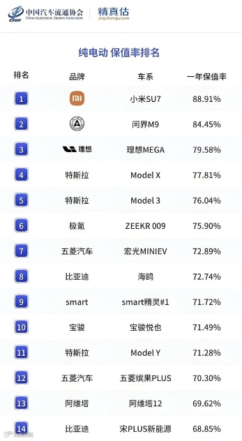 纯电领域,小米SU7和问界M9成为唯二保值率超80%的车型,理想MEGA、特斯拉Model X紧随其后。昔日热门Model Y跌出前十,排第十一。