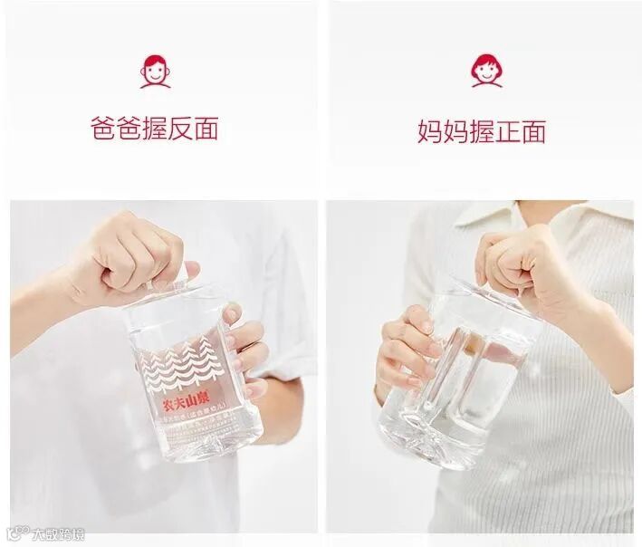 设计师考虑到爸爸妈妈的手掌大小不同,对这款产品的瓶身做了特别的设计,不同手掌大小的消费者可分别从不同位置握住产品。