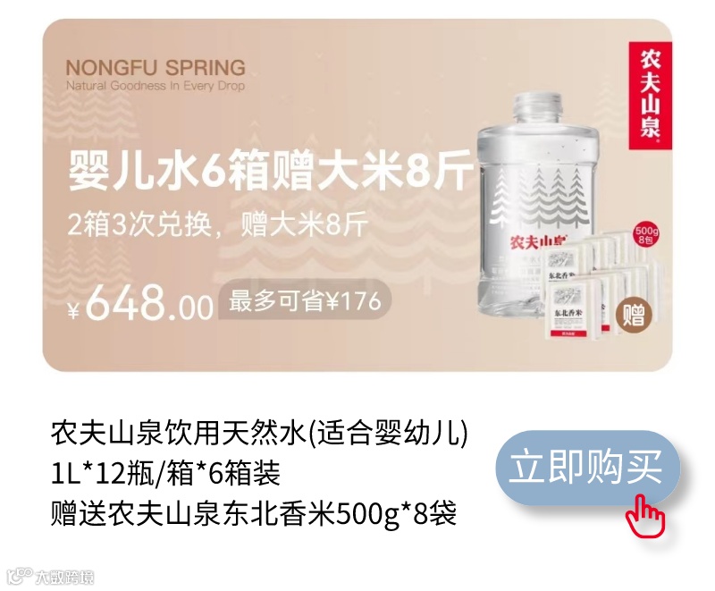 现在在送水到府下单——农夫山泉饮用天然水(适合婴幼儿),可享受超值活动价,立省12元!