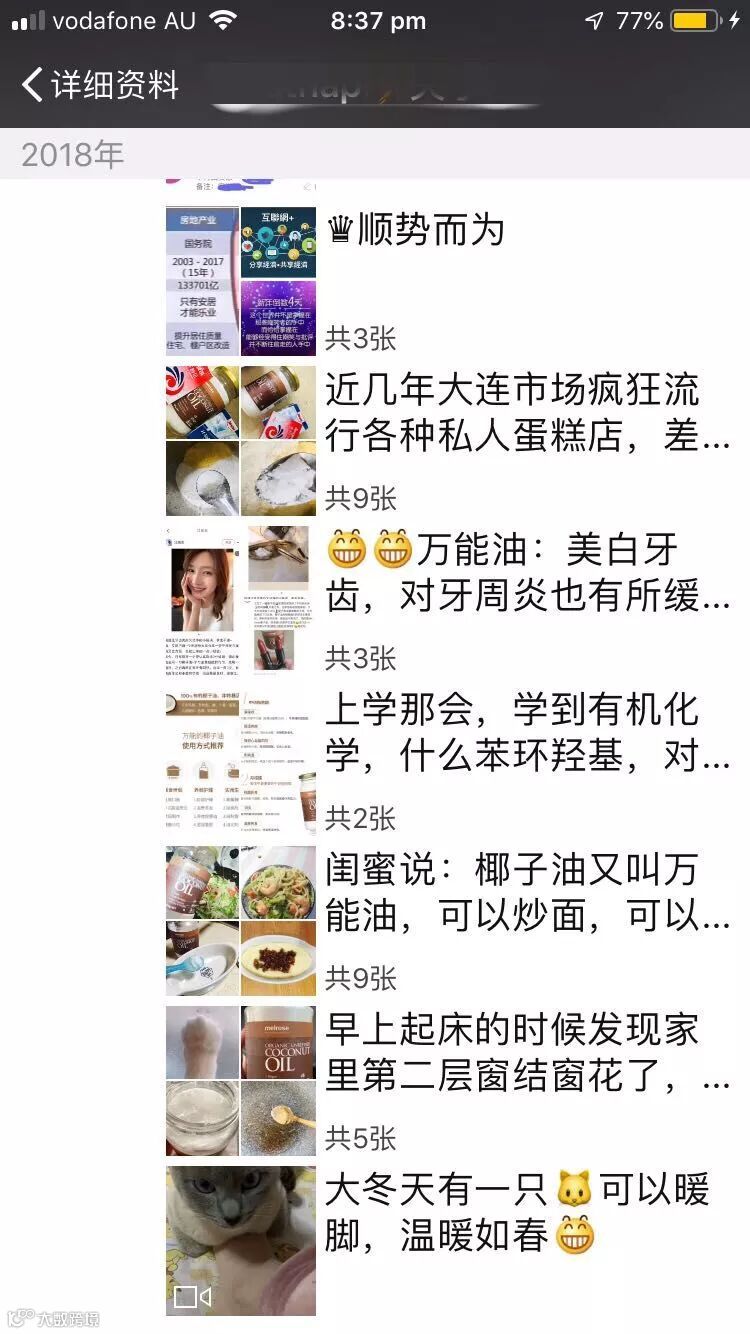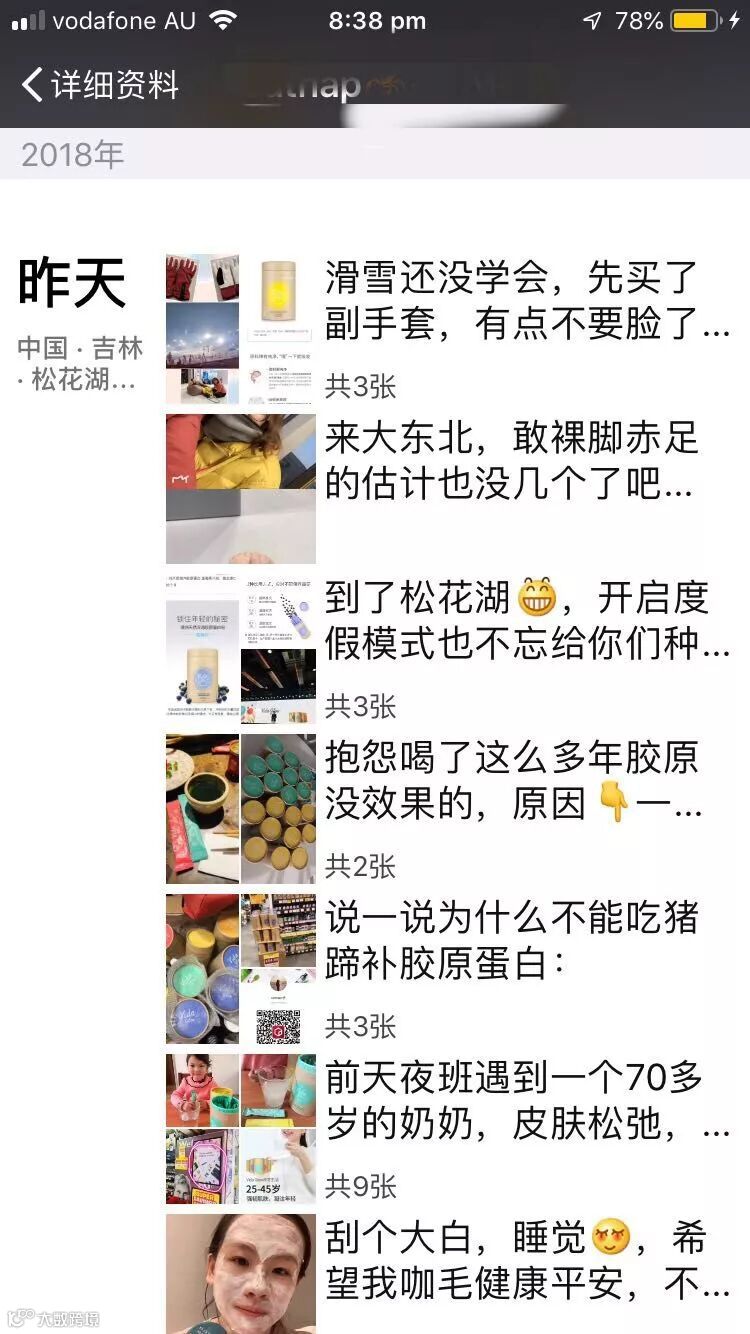 另外,把朋友圈卖货做的认真,专业,就像做我们的本职工作一样。认真,体现在图片清晰,自己自用,自拍产品图片多,即使是复制广告,也稍加修改修改,形成个人风格。专业,体现在产品能自用的先自用,熟悉每一种产品的包装,性态,口味,产地,功效,使用后的反应,感受,禁忌人群,孕期经期哺乳期能吃不能吃,这些知识具备了,会投射在每一条朋友圈里,每一次售前售后服务里。