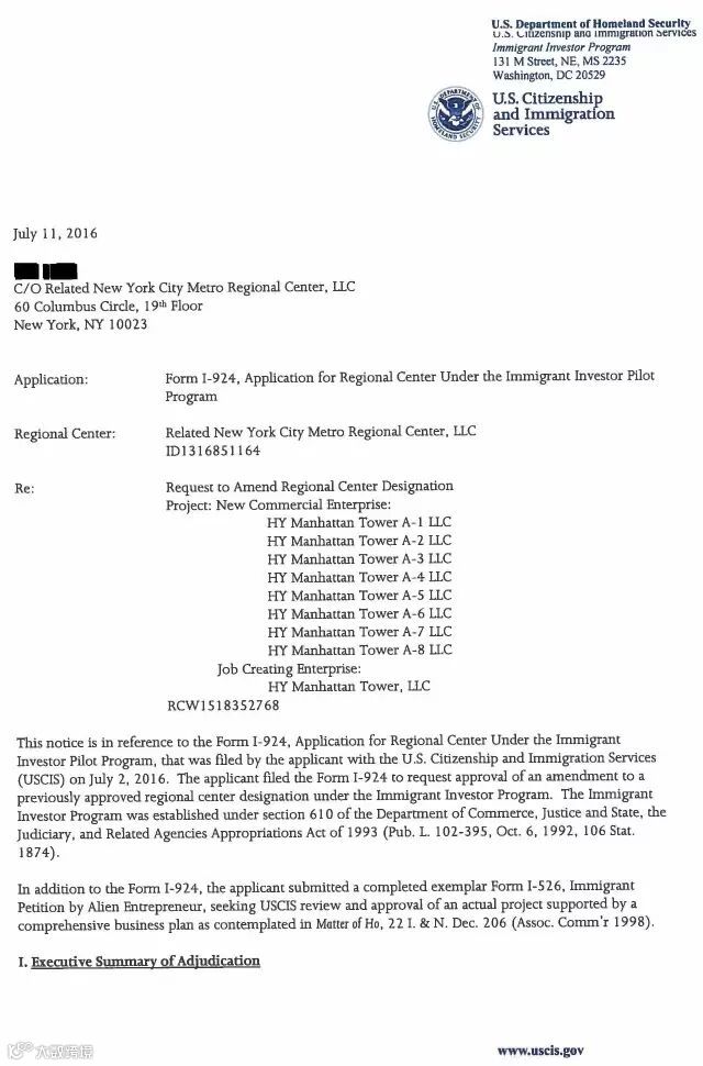 请注意!此份 I-526范本批准了曼哈顿大厦A1-A8组的所有项目,也就是意味着您的移民申请(I-526)只需审核个人文件,即可获批。
