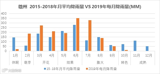 每年7-12月是脐橙的果实膨大和成熟期,今年该时期赣州降水量较少,特别10-11月,几乎滴雨未下(如图表所示),赣州气象局一度发布了干旱橙色预警。如此反常的天气,对于脐橙这种对于水分需求较高的水果,难免会有一些影响。