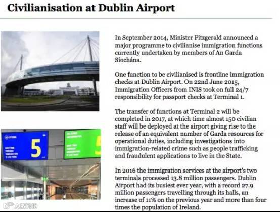 1、 都柏林警局的警力开始从登记注册服务中解放出来,投入到移民犯罪调查中去。其中一项事务就是都柏林机场的移民审查。2015年6月22日,INIS的移民办公室接管了1号航站楼的护照审查任务。2号航站楼的事务交接将于2017年结束,届时会有150个移民局员工在机场工作,因此原来负责这些事务的警察将会把警力投入在调查移民相关犯罪,比如走私人口、虚假申请等。