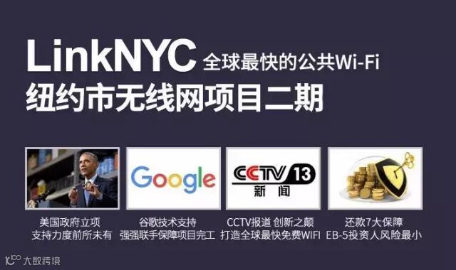2. 在最新公布的广告签约名单中,纽约市交通厅也位列其中,政府部门用实际行动支持纽约市WIFI项目(二期),使之成为全球唯一在建设期内获得收益的美国投资移民项目。截至上周,已签约广告协议共几十个世界级公司,并且更多的国际知名公司签约使用LinkNYC的广告位。当下在运行的连接亭,已经在源源不断的产生广告效益!通过地毯式的覆盖纽约市,LinkNYC网络将创造出美国最激动人心和强大的广告平台之一。