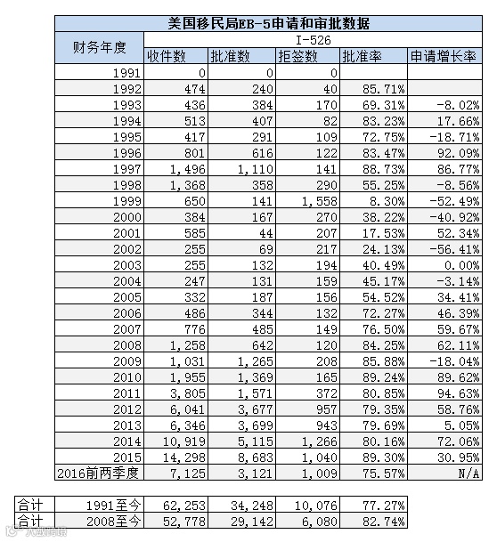 2.合计栏目,参考IIUSA的统计办法,区分了从1991年至今的统计数据,和2008年至今的统计数据。原因在于,早前的通过率,由于USISA的审批政策波动,对于现今的参考意义不大(特别是1998年收紧政策,严重影响了EB-5的审批通过率,随后获得了某种程度上的纠正)。