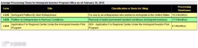 美国移民局(USCIS)也更新了截至2016年2月29日的投资移民项目办公室(IPO)的平均审核时间,如图: