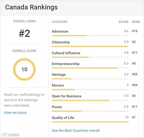 在对全球所有年龄层的调查中,加拿大各项评分都很高:加拿大的生活质量得到了满分10分,排名全球第一。公民素质得分9.9,排名全球第二。商业氛围及企业也进入了全球前五名。
