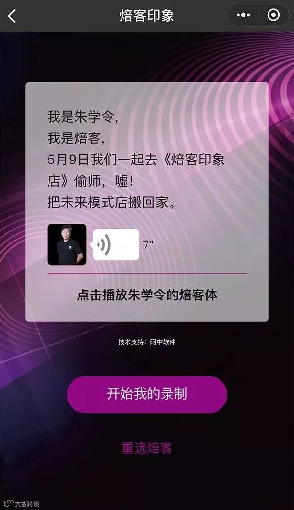 通过该界面用户可与选择的焙客大咖共同录制语音邀请,录制完成后系统将自动把用户的语音与焙客语音进行合成,随后可听取自己和该焙客的专属合成语音。按下“完成录制”后,用户可以按下“一键分享”将合成语音发送给微信好友。