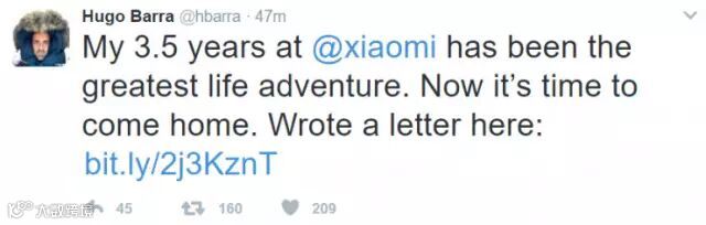 1月23日,小米公司副总裁雨果·巴拉(Hugo Barra)在Twitter上宣布离职,将返回硅谷工作。雨果·巴拉在自己的Facebook主页上发布博文,称长期生活在这样的环境下(给足了面子,并没有直接指明“这样的环境”就是北京的雾霾),已经对自己的生活和健康都造成了非常严重的影响。他表示,目前小米的国际化扩张之路非常顺利,已经到了离开的时候。