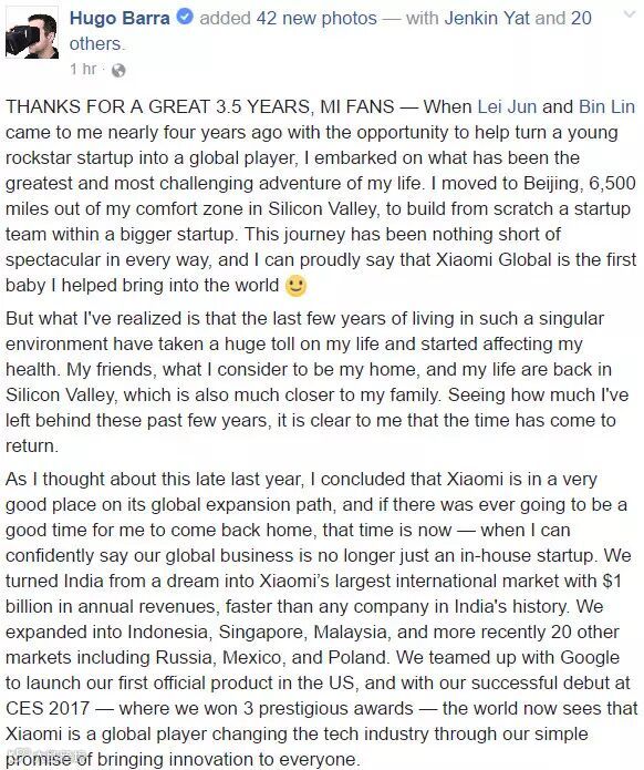 小米总裁林斌表示,“Hugo三年半之前加入我们,那也是小米开始国际化的时刻,我们一路相伴。我非常感谢他对小米所做的贡献。我们希望他在北京,在小米的时间能越多越好,我们也理解他个人面对的挑战,祝愿他的未来一切都好。我也非常期待他以顾问的身份继续和小米亲密合作。小米高级副总裁王翔将领导我们整个国际业务继续向前。2017年,我们雄心满满,相信王翔能带领小米的国际业务更上一层楼。”