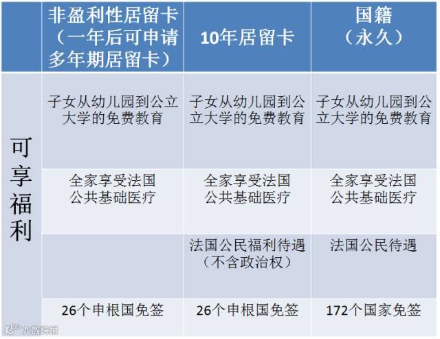 非盈利性居留卡的持卡人享有法国公共基础医疗福利,可自由出入26个申根国,未成年子女可享受从幼儿园到公立大学的免费教育。