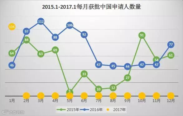仅仅是2017年1月份,黄金居留许可获批的主申请人就有221位,附属申请人就有401位,相较于2015年每月平均获批64位主申请人,2016年每月平均获批118位主申请人,获批速度可谓是质的飞跃!飞跃!飞跃!