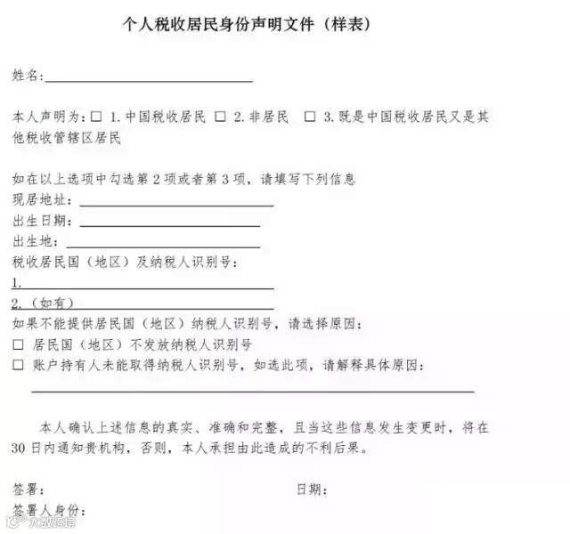对于在金融机构开立新账户的个人和企业来说,在开户时仅需额外填写一份声明文件,声明其税收居民身份。对个人而言,需要声明是否为中国税收居民或者非居民。