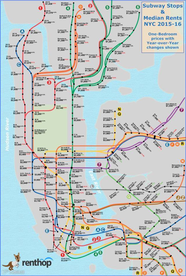 这个数据是根据RentHop网站上的租房资源在主要地铁站附近0.5英里范围内的单间卧室价格而得出的,最终在1号线的23街地铁站附近,单间卧室的月租中位价是4000美元,达到全纽约市最贵。