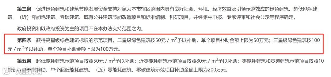 三星级绿色建筑按100元/㎡予以补助,单个项目补助金额上限为100万元。