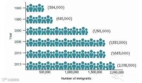 美国移民政策研究所的数据显示,中国已成为仅次于墨西哥人和印度人的移民美国大军,人数超过200万,占美国人口的5%。