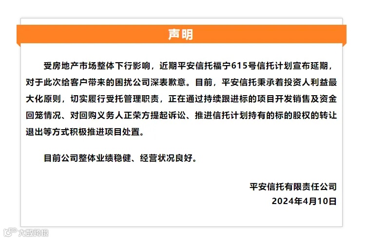4月9日,平安信托客户维权事件在网络上刷屏,对此平安信托在4月10日,平安信托发布声明称,受房地产市场整体下行影响,近期“平安信托福宁615号信托”计划宣布延期,对于此次给客户带来的困扰公司深表歉意。