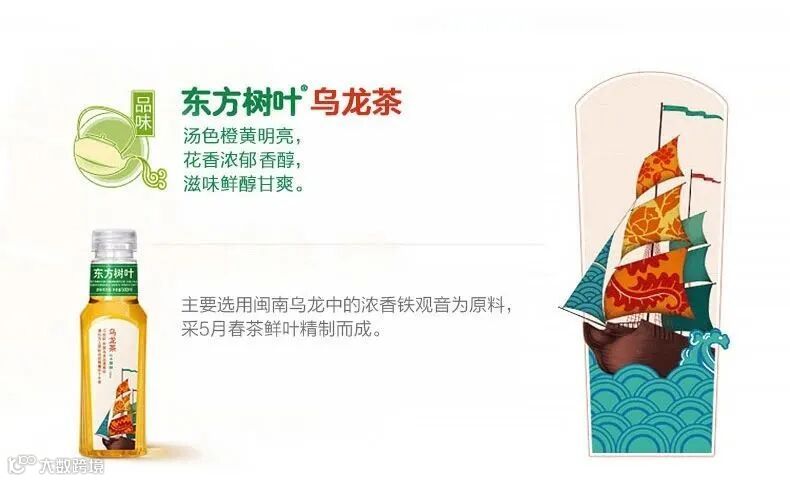 东方树叶于2011年5月上市。它的配量表上只有短短一行字:水、茶叶,维生素C和小苏打。意味着,这是一款真正的无糖茶,不仅不添加任何糖或甜味剂,而且不添加茶粉、不添加香料。100%茶叶自然抽出,无菌冷灌装工艺生产,保留原茶的色、香、味。
