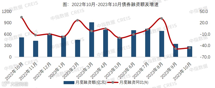 而2023年10月房地产企业债券融资总额为276.4亿元,同比大幅下降46.2%,环比下降19.5%。行业债券融资平均利率为3.49%,同比上升0.19个百分点,环比下降0.22个百分点。2023年1-10月房地产企业债券融资总额为5875.1亿元,同比下降8.9%,降幅较上个月扩大3.2个百分点。