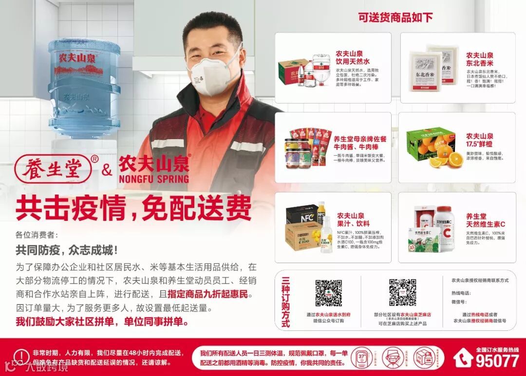 除此之外,我们还在努力为全国范围的消费者保障产品供应,让利惠民。即日起,养生堂&农夫山泉推出“共击疫情,免配送费”服务!