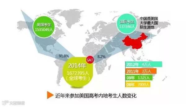 SAT官方机构美国大学委员会披露的数据显示,来自大陆的考生2008年7000人、2009年1.5万人、2011年2万人、2012年激增至4万人。2014年全球参加SAT的国际考生人数达到13.73万人,这其中有一大部分为中国、韩国学生。
