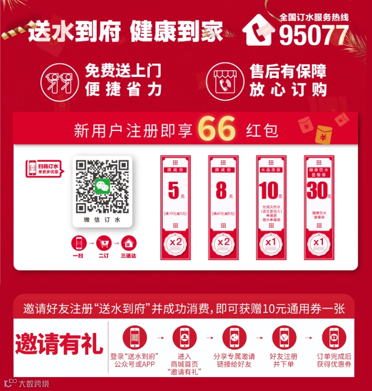2、用户进入“送水到府”商城即可领取3元无门槛券和5元满减券,每位用户仅可参与一次(“农夫山泉送水到府”微信小程序和95077不参与领券活动)。