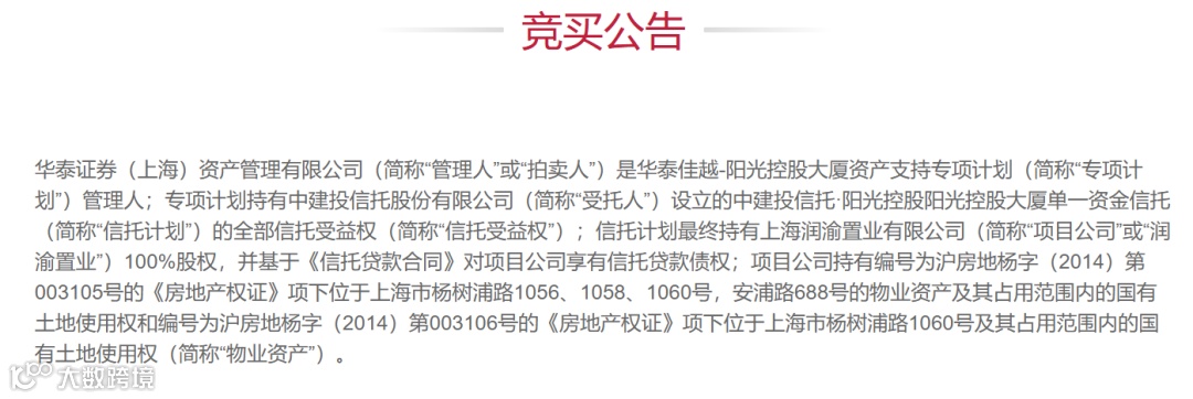 据竞买公告,上述物业资产的处置方是华泰证券(上海)资产管理有限公司,该公司是“华泰佳越-阳光控股大厦资产支持专项计划”的管理人;物业资产标的所涉及的债务人为上海润渝置业有限公司和上海臻德房地产开发有限公司,所涉债权初始金额为9.33亿元;而其债权人则为中建投信托股份有限公司。